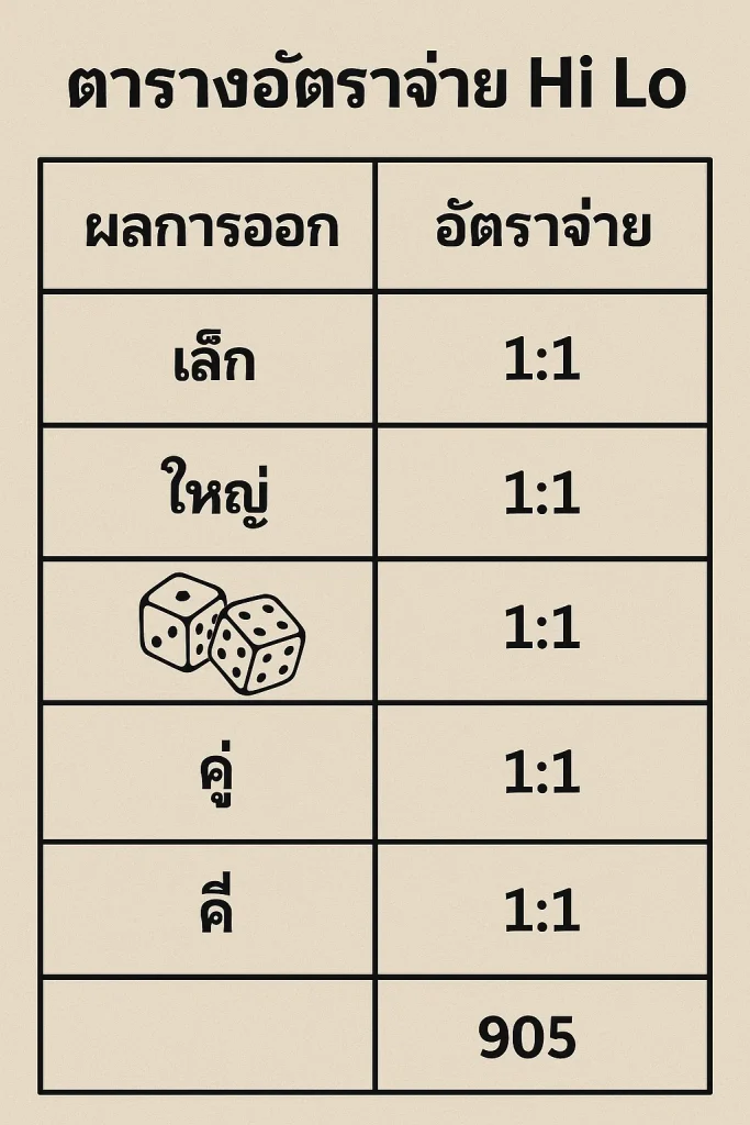 Hi Lo เป็นเกมที่ใช้ลูกเต๋า 3 ลูก โดยเจ้ามือจะเขย่าแล้วเปิดผล ผู้เล่นสามารถเลือกแทงได้หลายแบบ เช่น สูง–ต่ำ เต็งเลข โต๊ดเลข คู่–คี่ หรือผลรวม ซึ่งความสนุกอยู่ตรงที่ “แต่ละแบบมีอัตราจ่ายไม่เท่ากัน” ผู้เล่นจึงต้องเลือกทั้งตามความมั่นใจและตามความคุ้มค่า